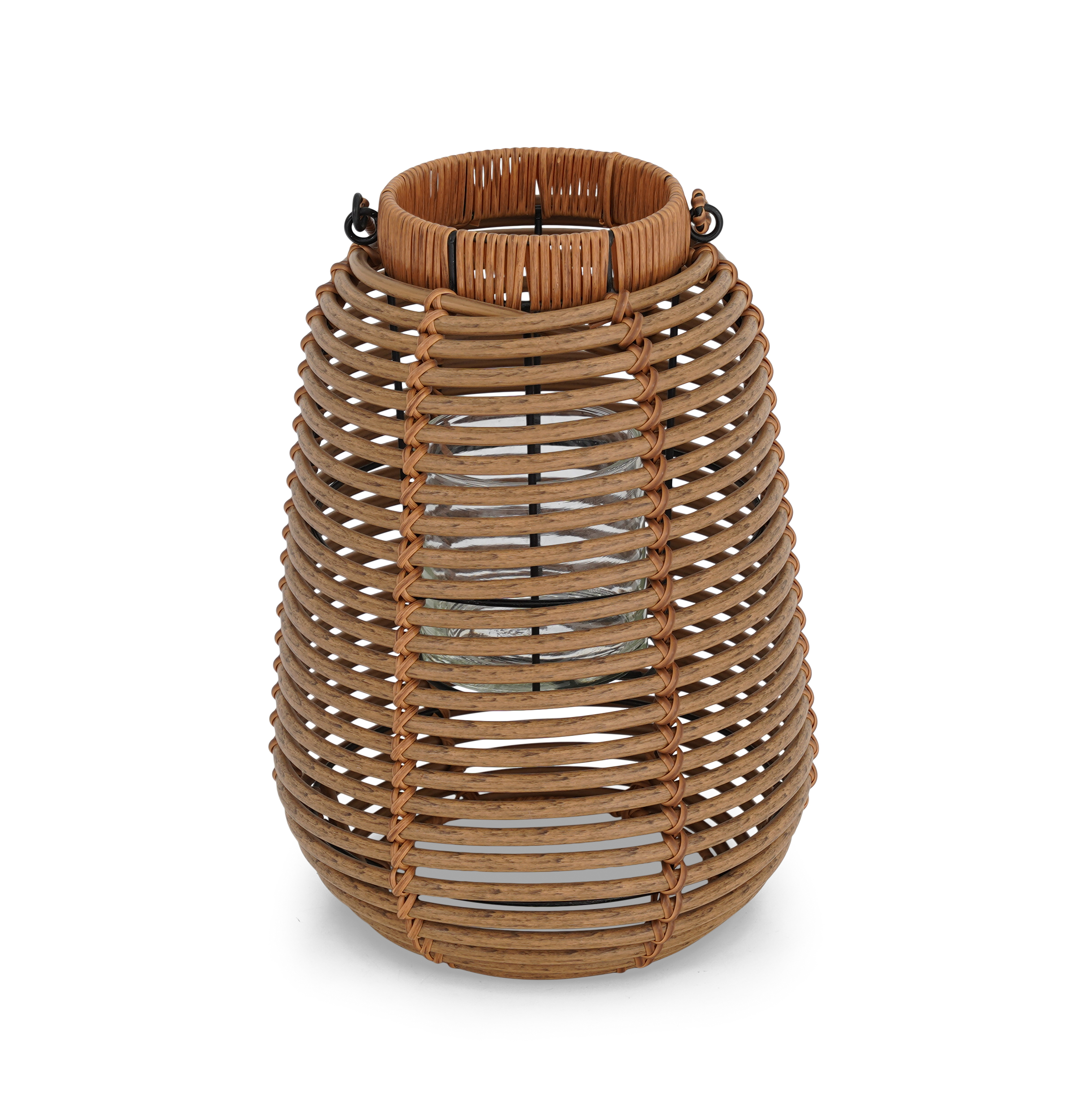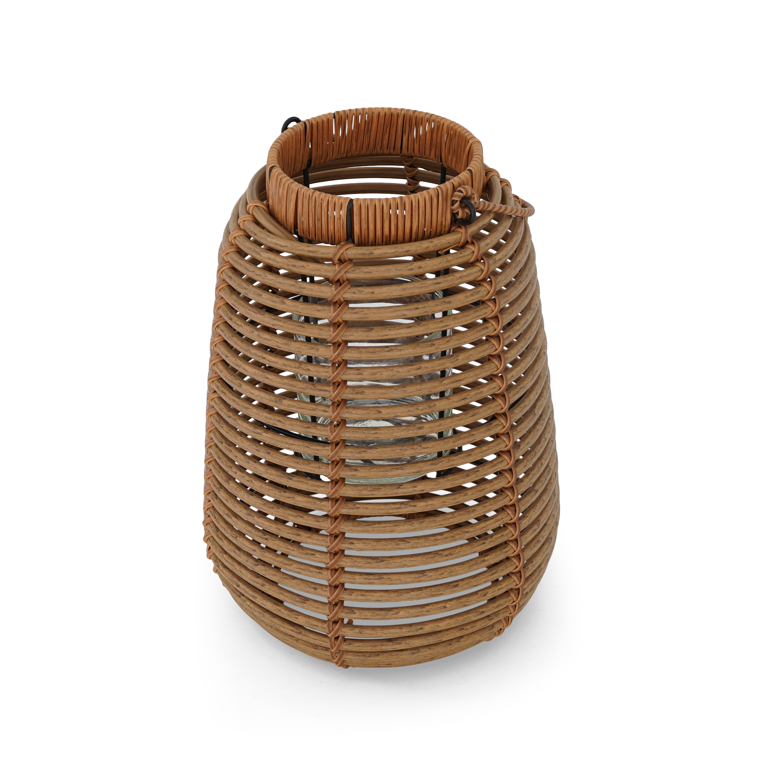 Small wicker rattan lantern with glass candle holder inside.
