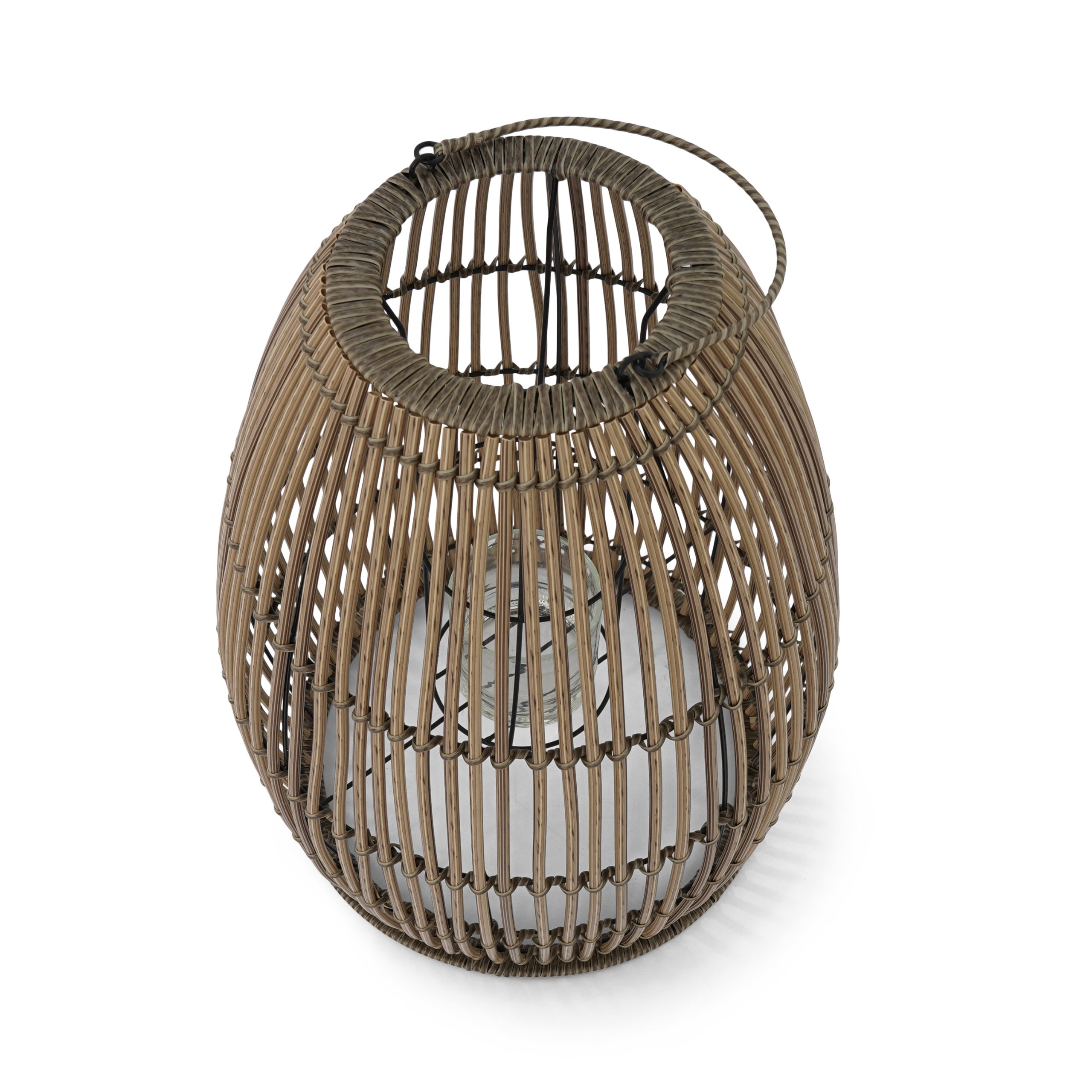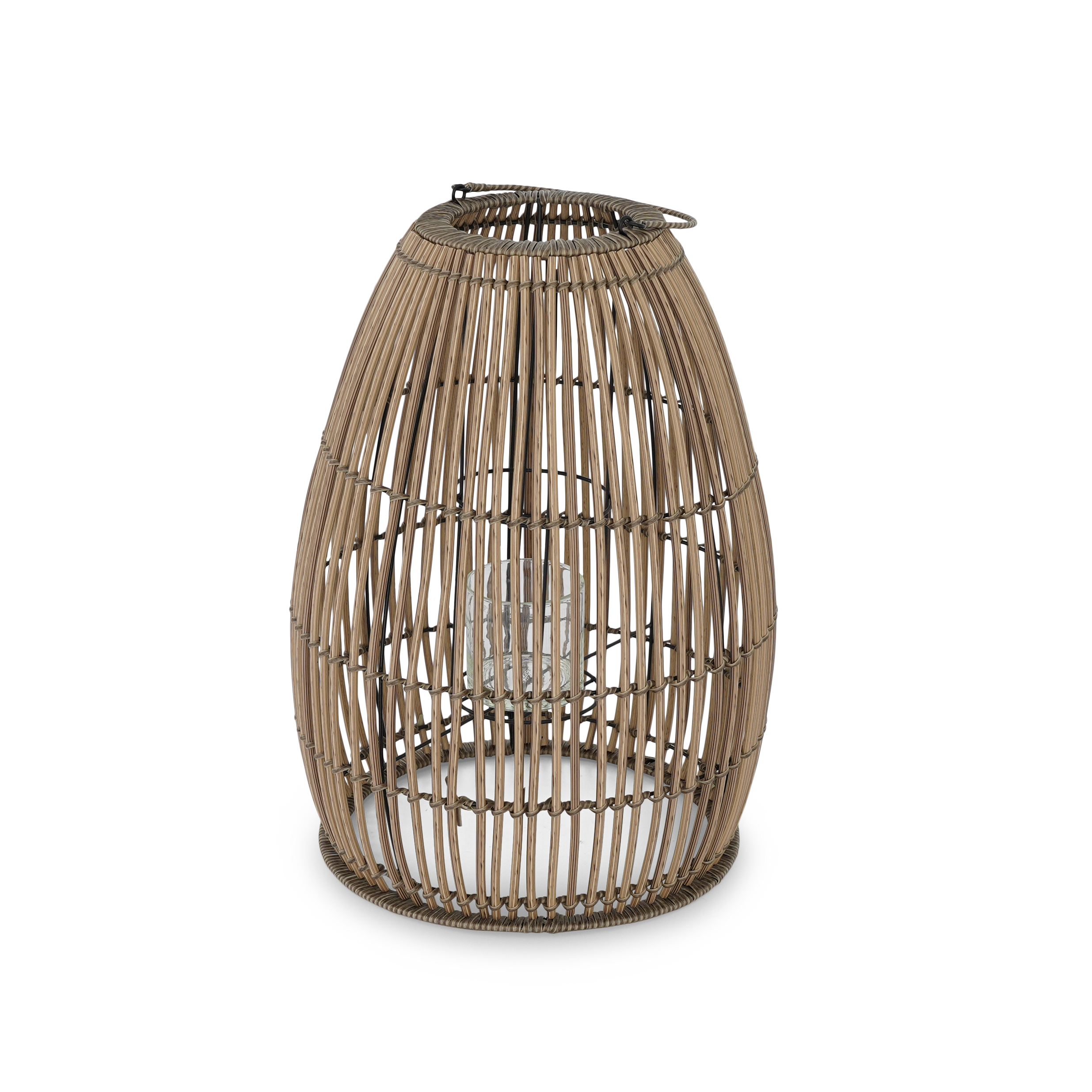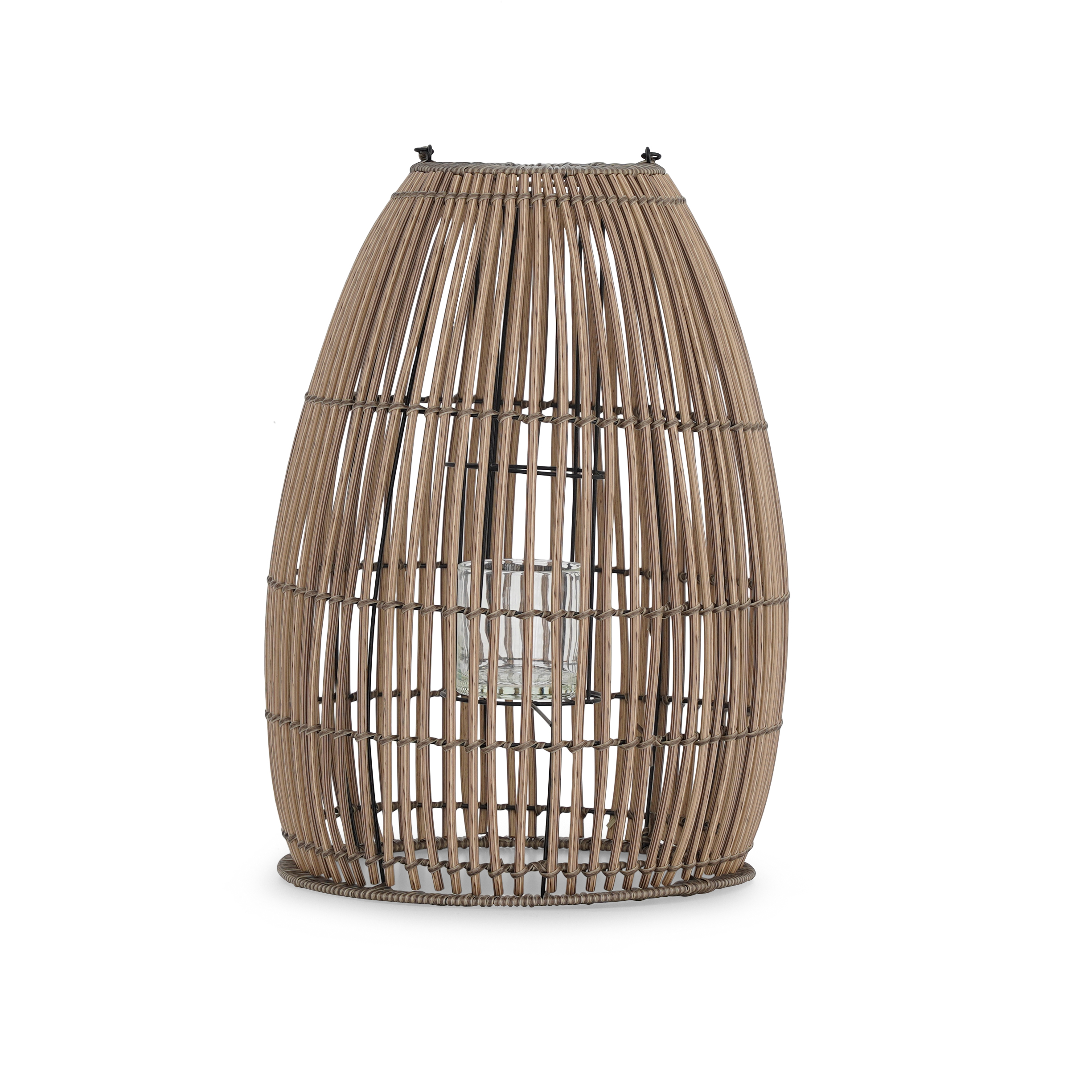Refined lantern with handcrafted wicker and elegant glass detail.