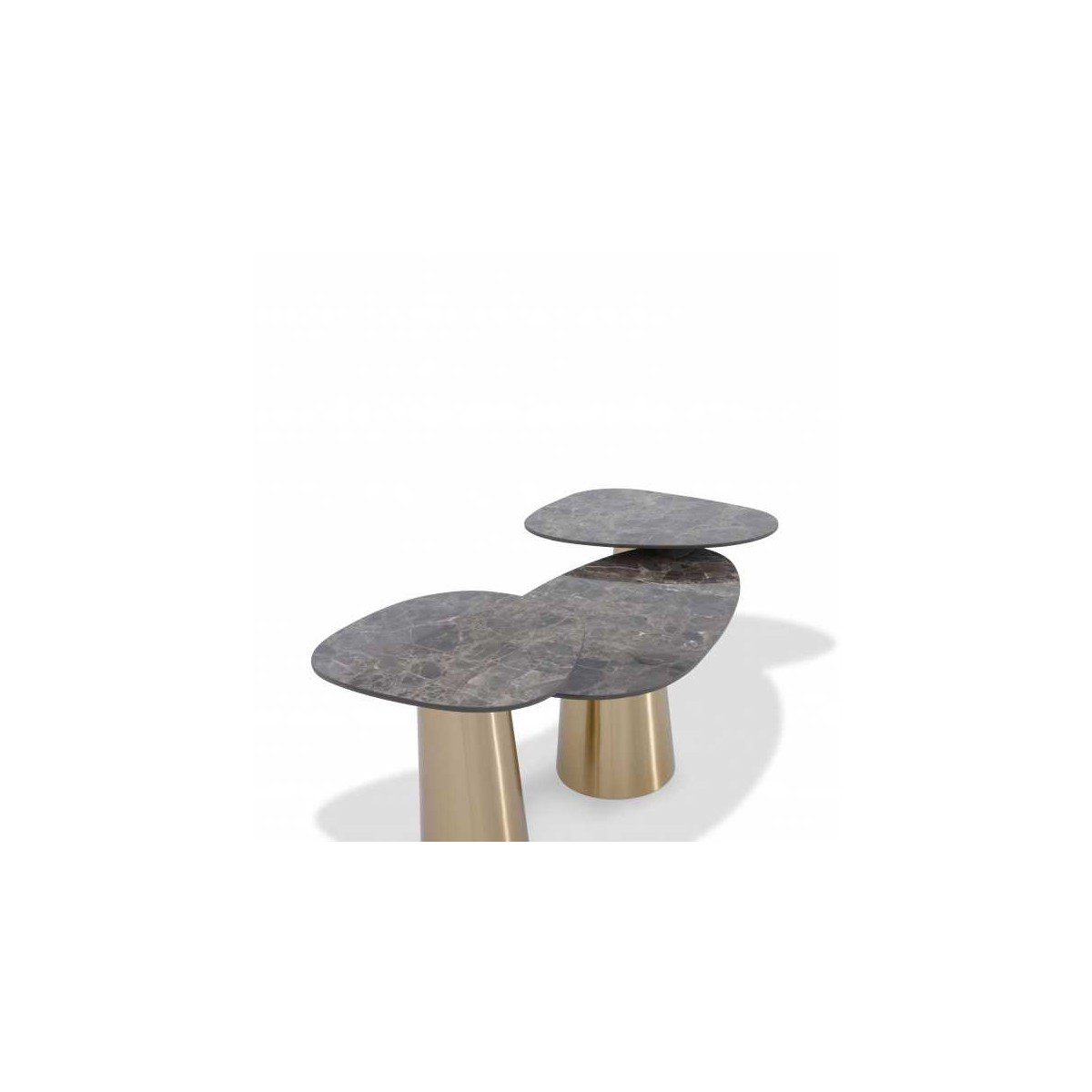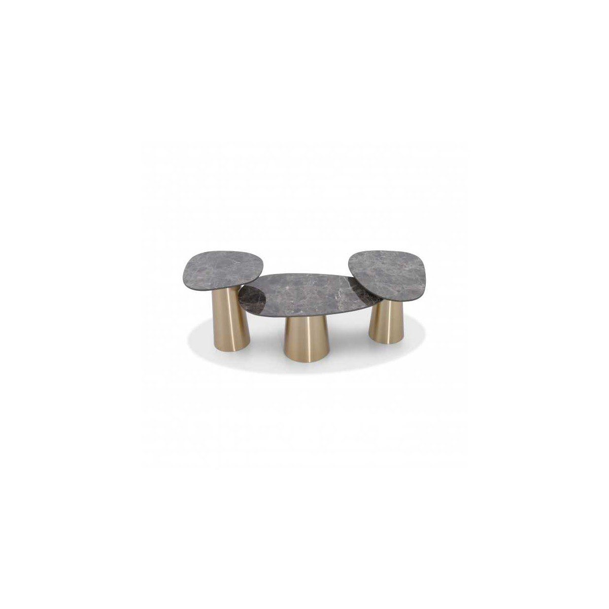 Three round marble tops on gold-toned bases.