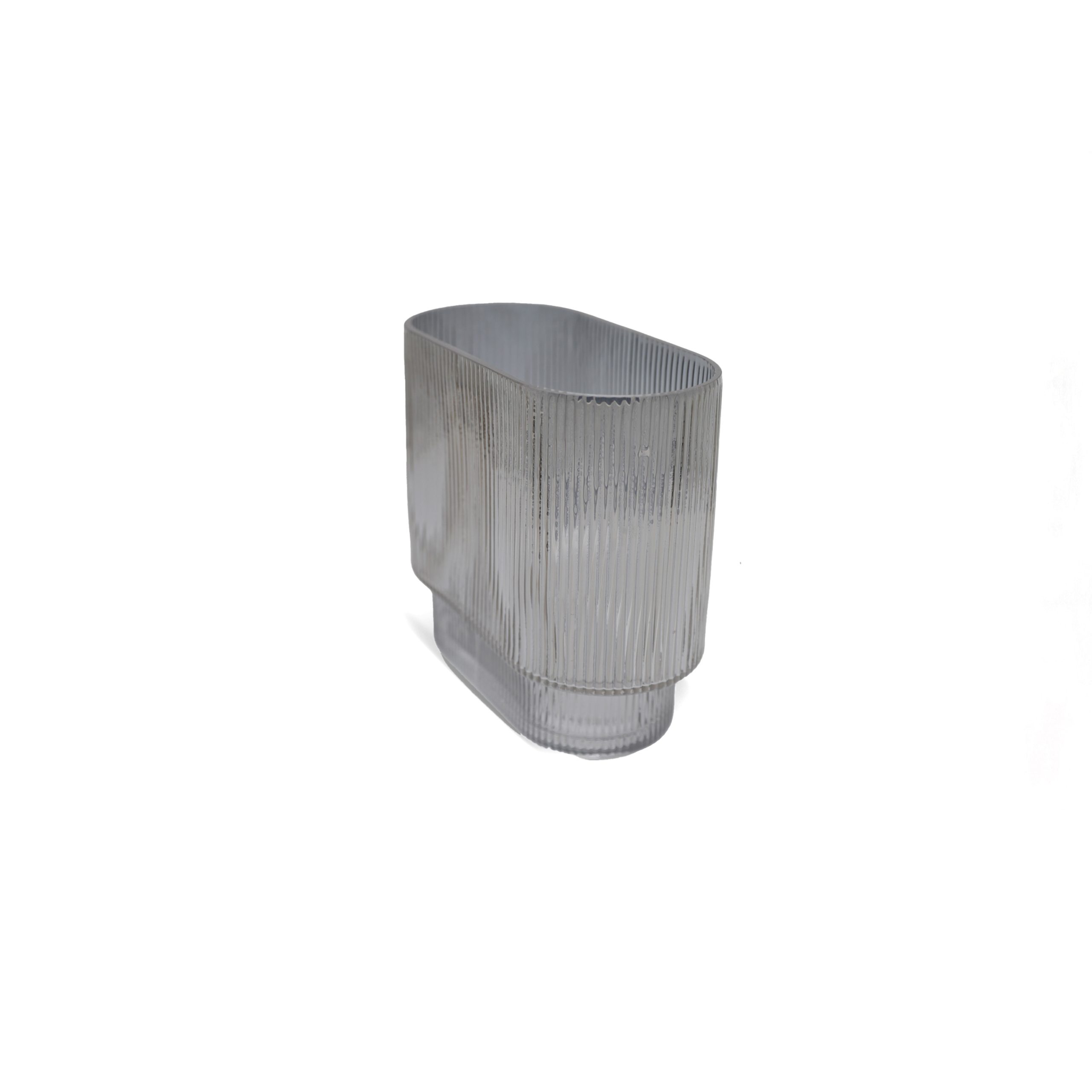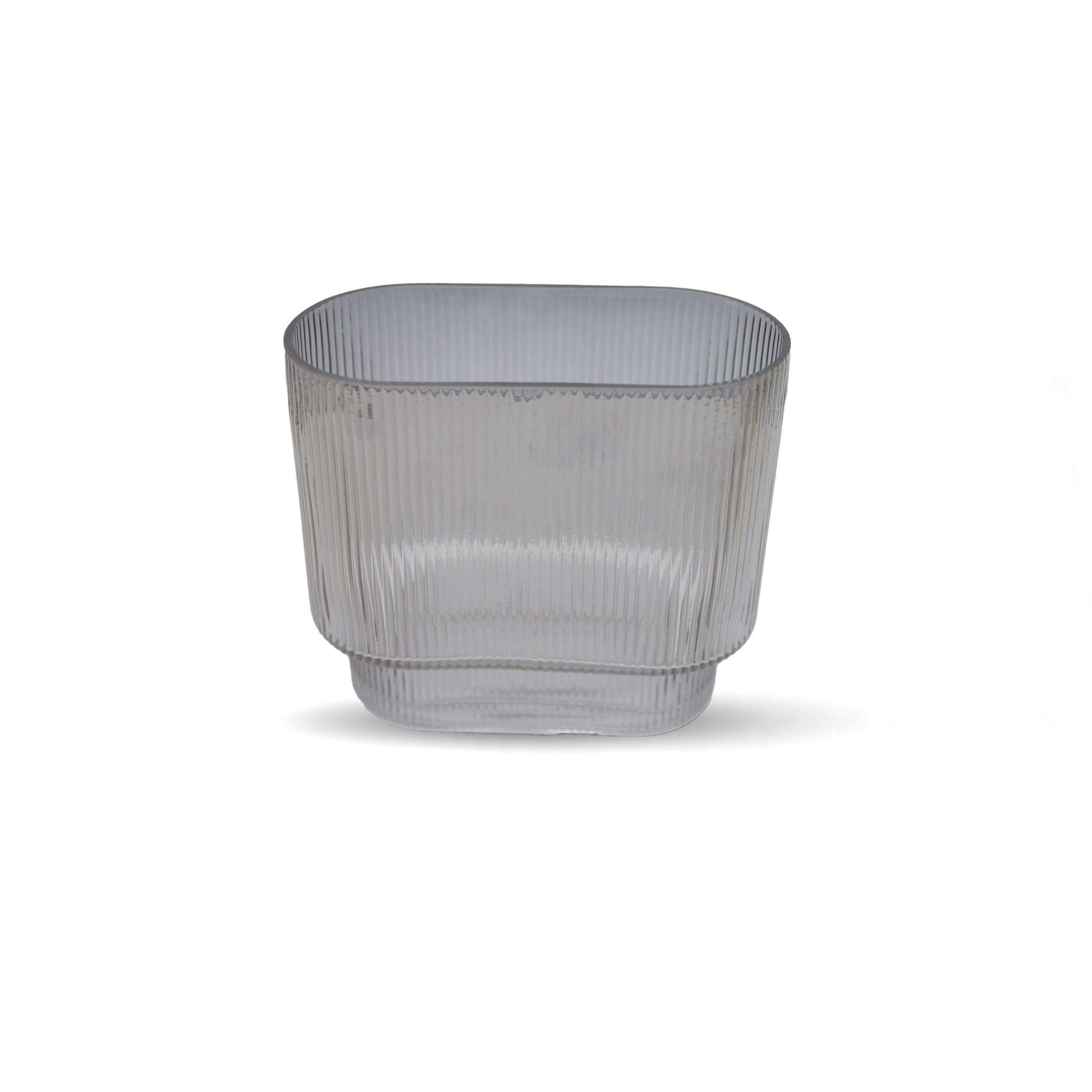 Wide smoked glass vase with subtle striped details, blending modern elegance with refined texture.