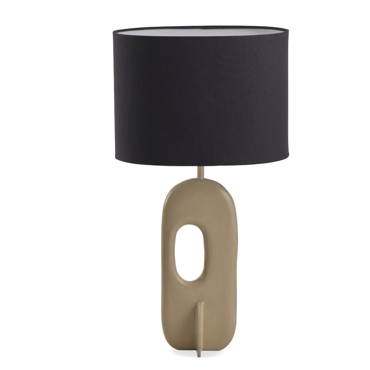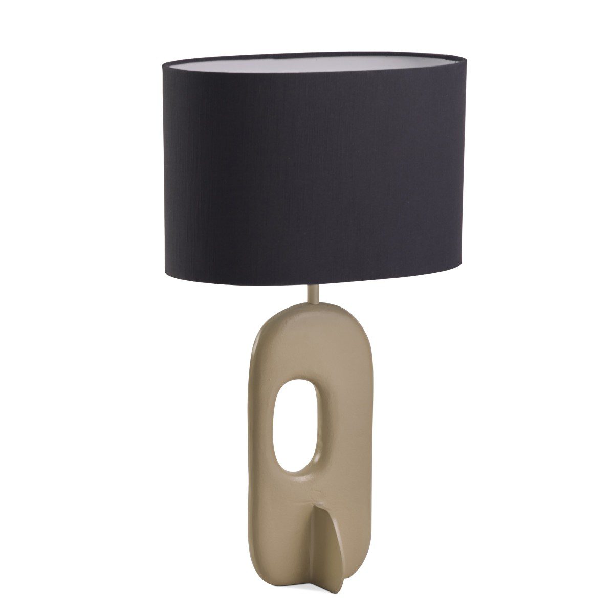 The lamp’s grey and mint green stone base, highlighted by brushed gold details, contrasts beautifully with its black shade.