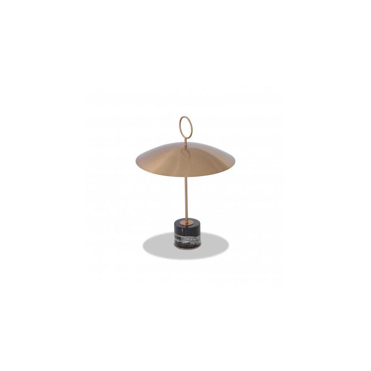 Brushed brass metal lampshade on black marble base.