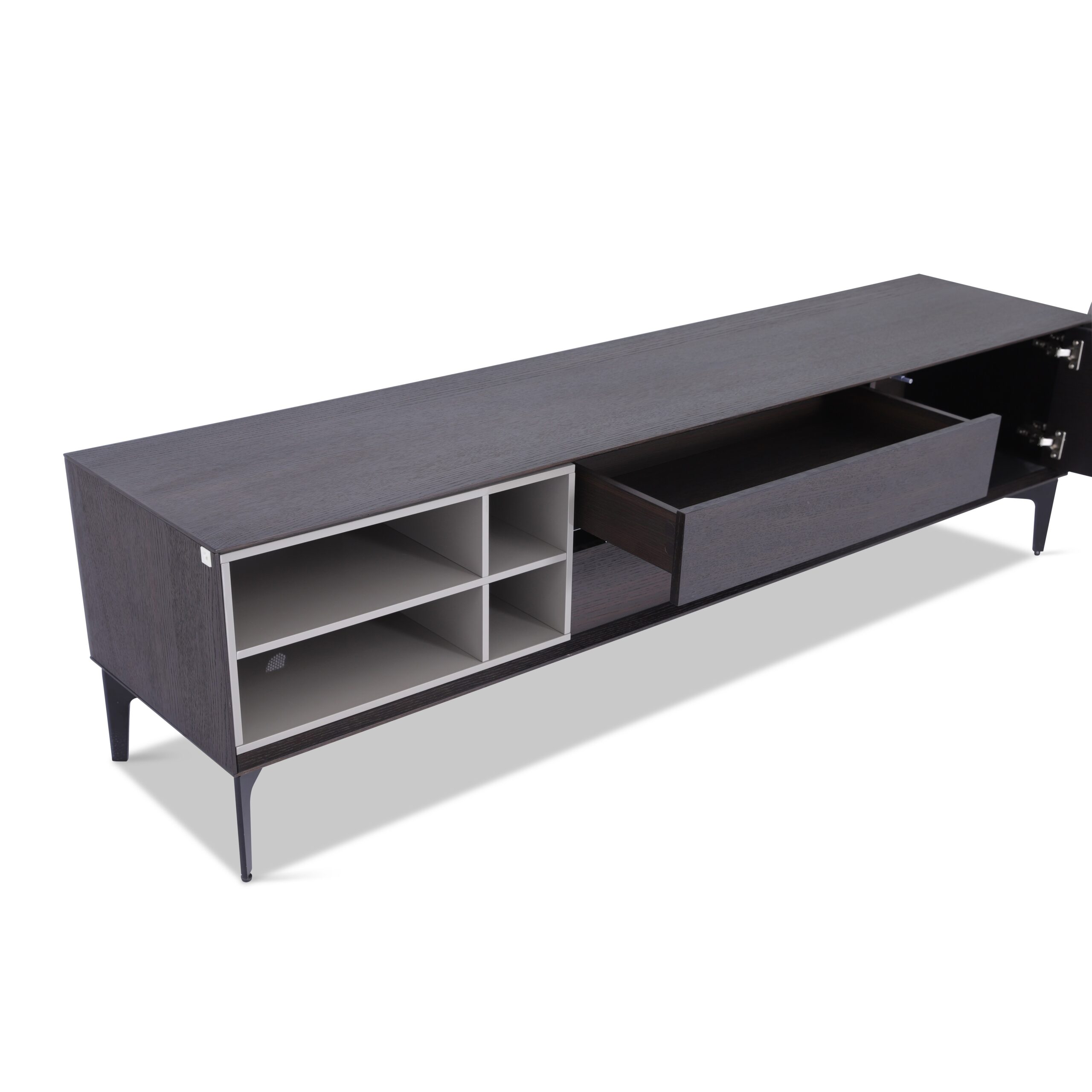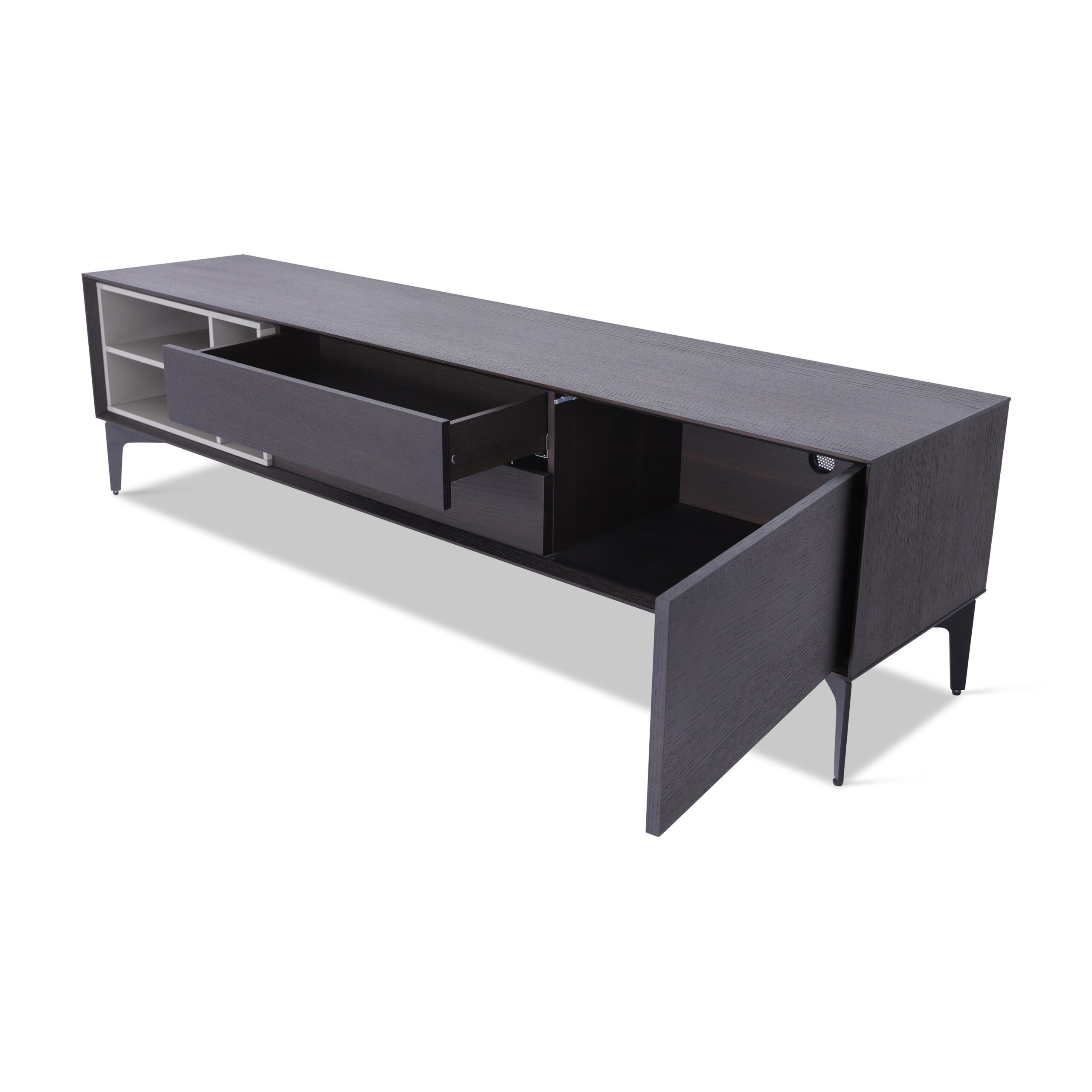 The unit is equipped with well-thought-out compartments and shelving, providing organized spaces for media players and other entertainment accessories.
