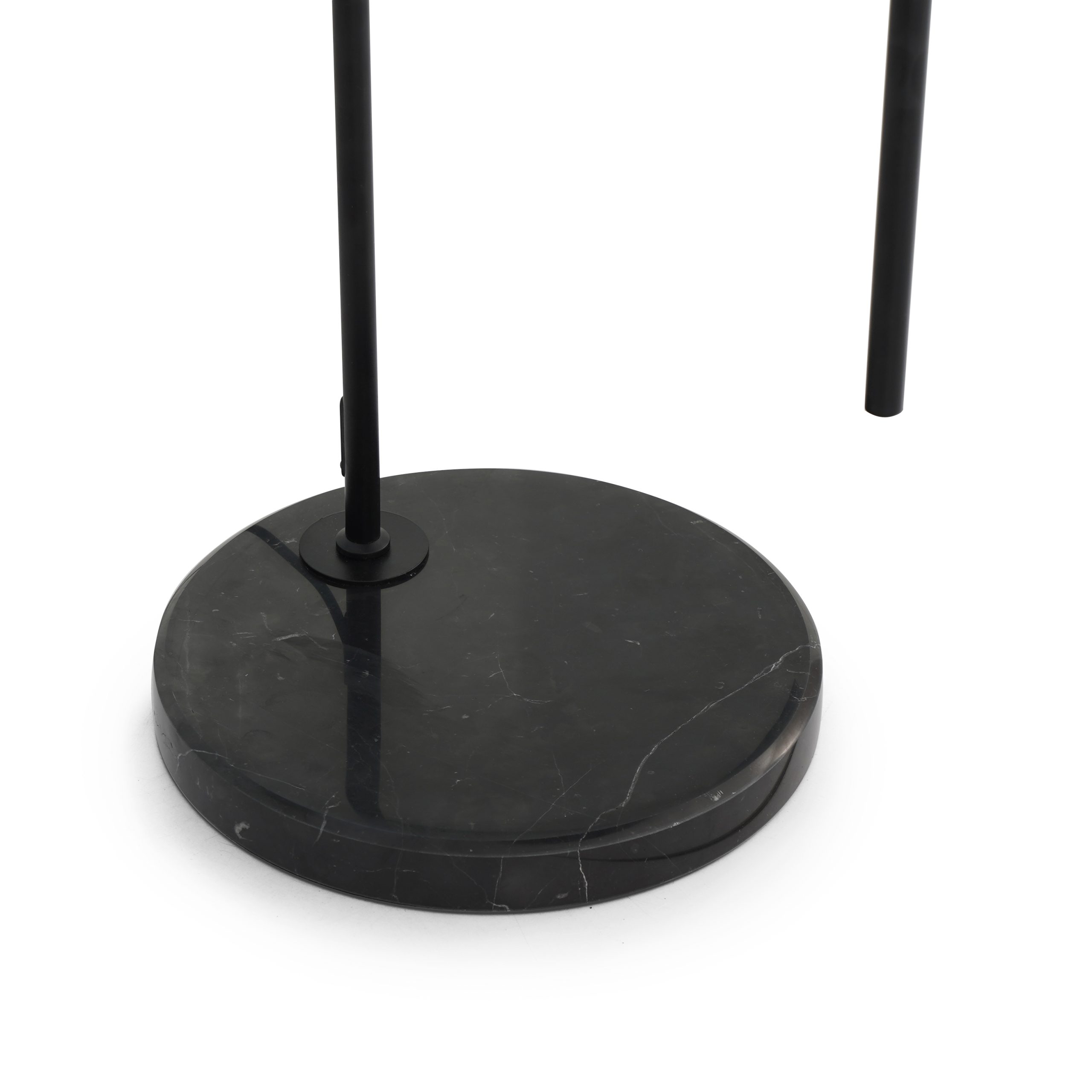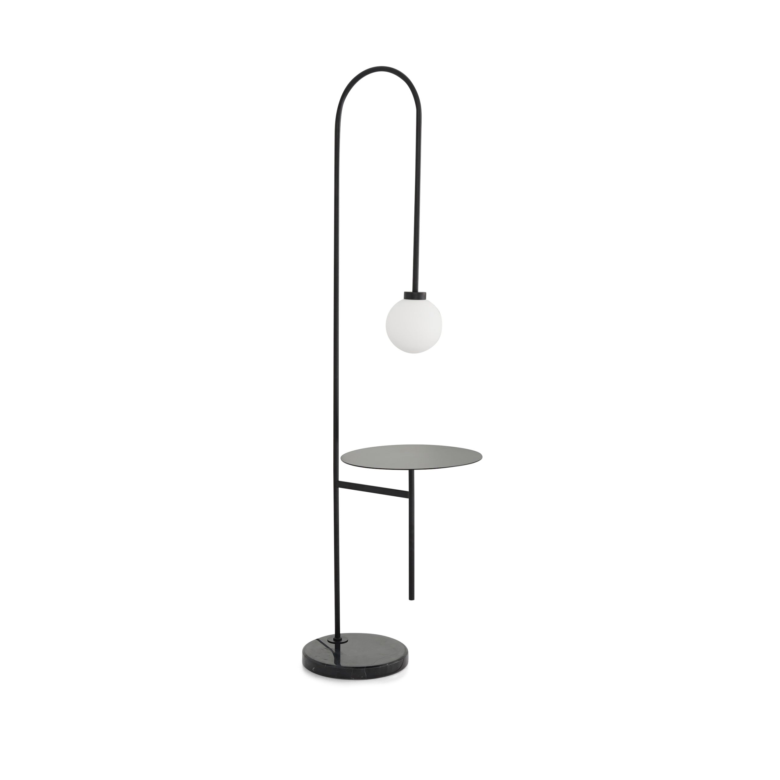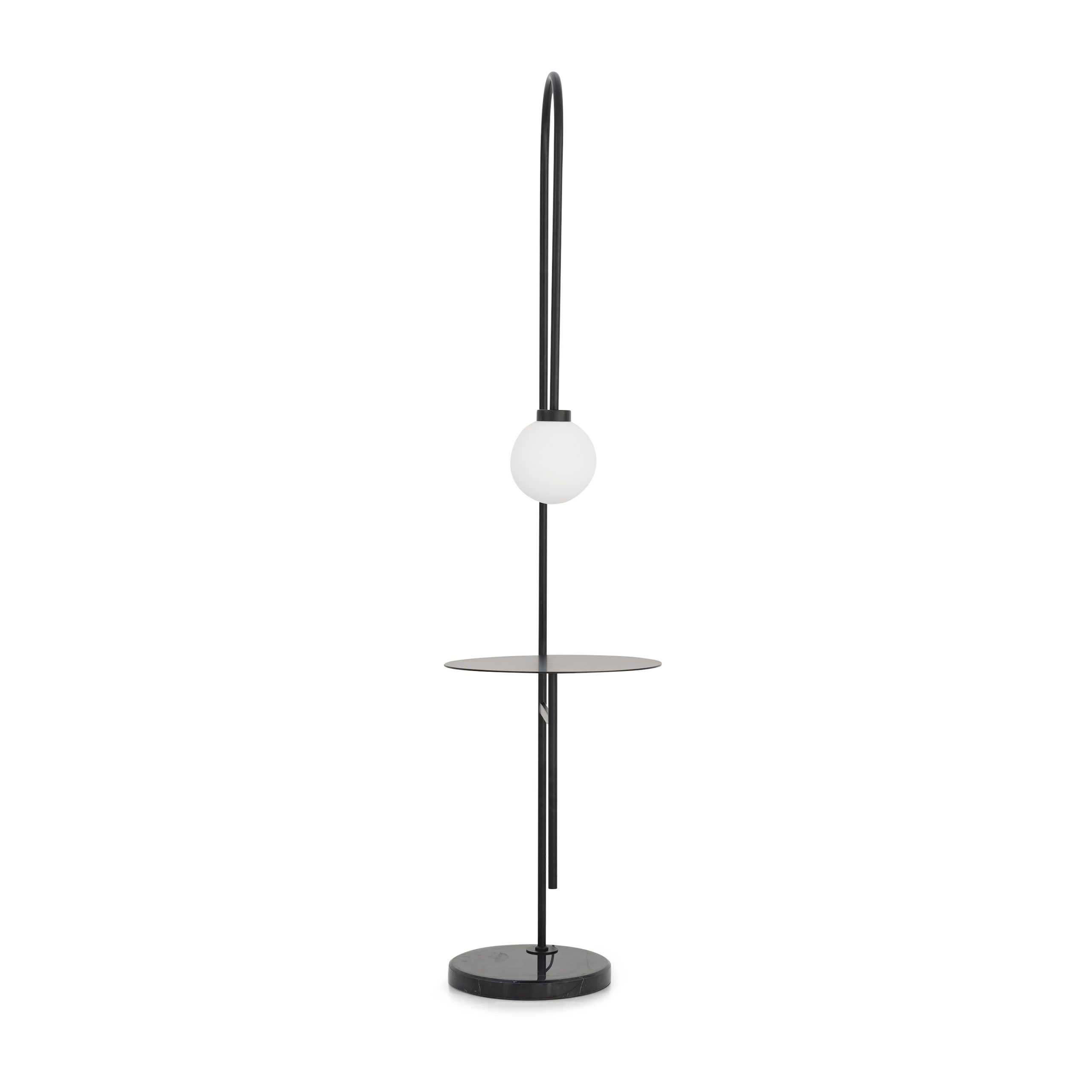 Floor lamp in black powder coated metal with an integrated shelf.