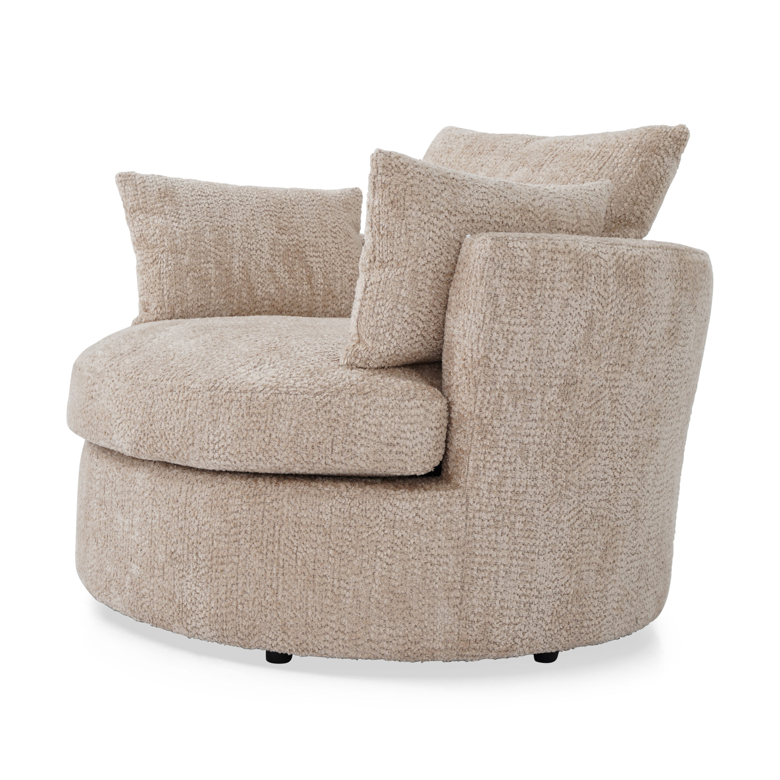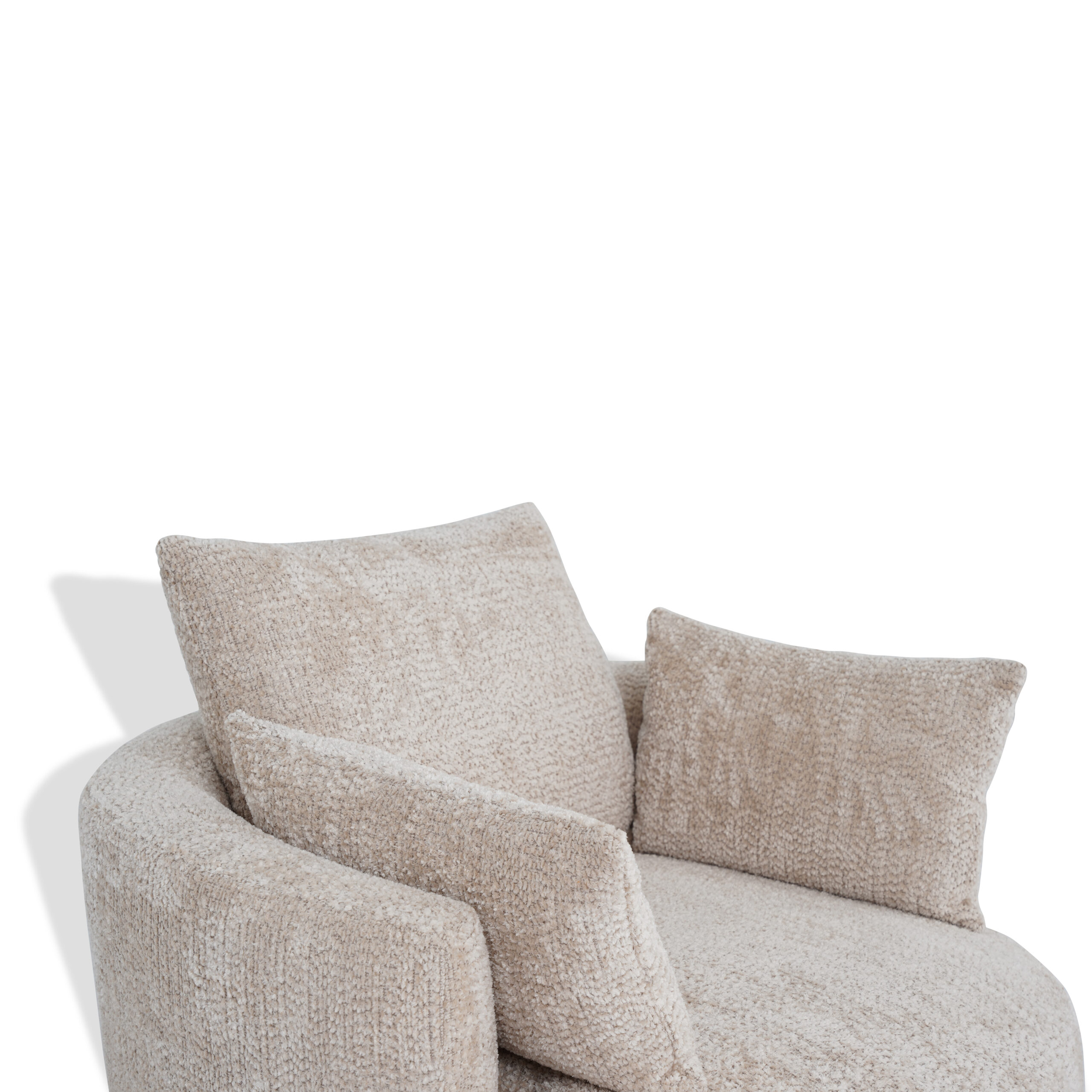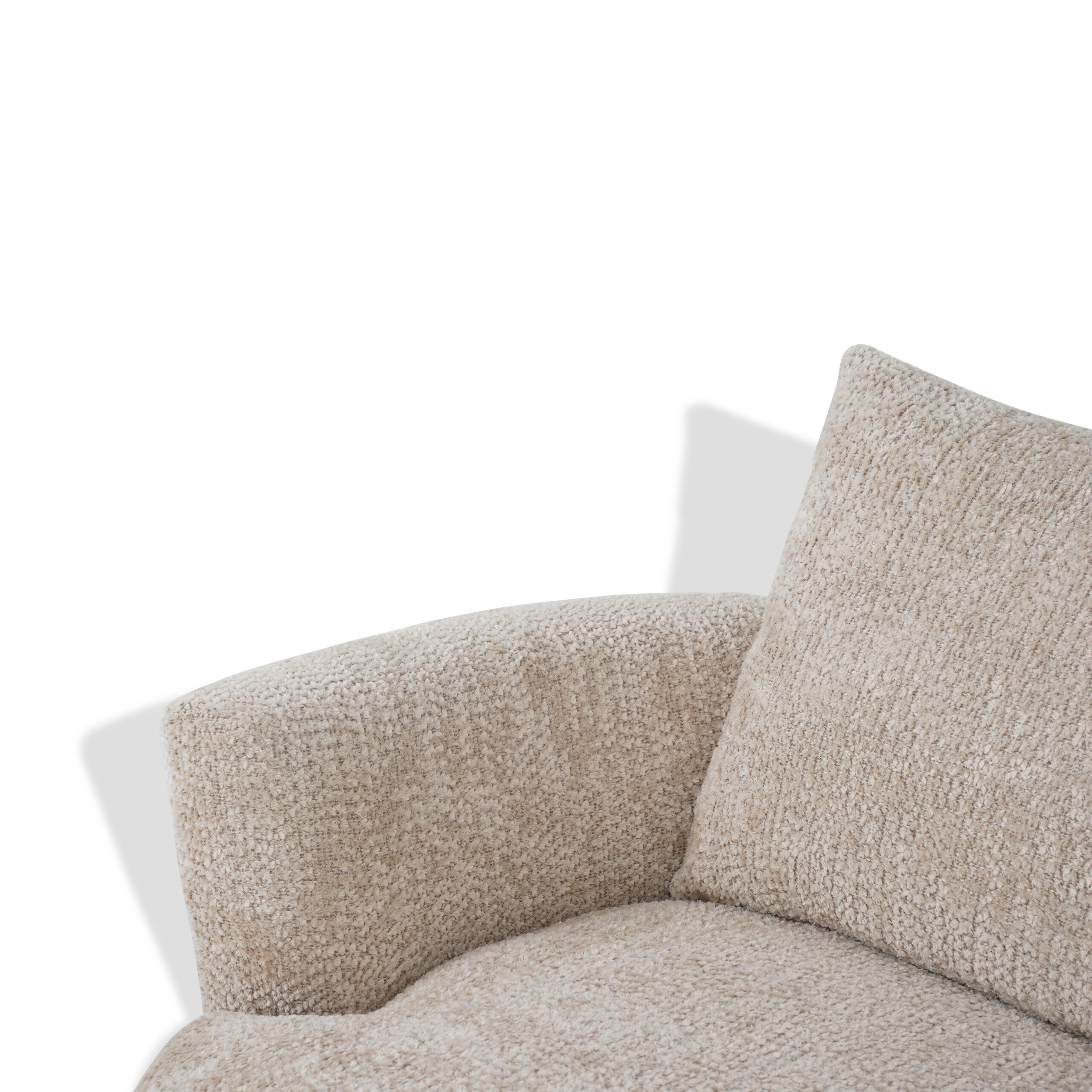 A fully upholstered armchair in beige linen tweed effect, designed with generous proportions and a refined silhouette for a statement of modern comfort.