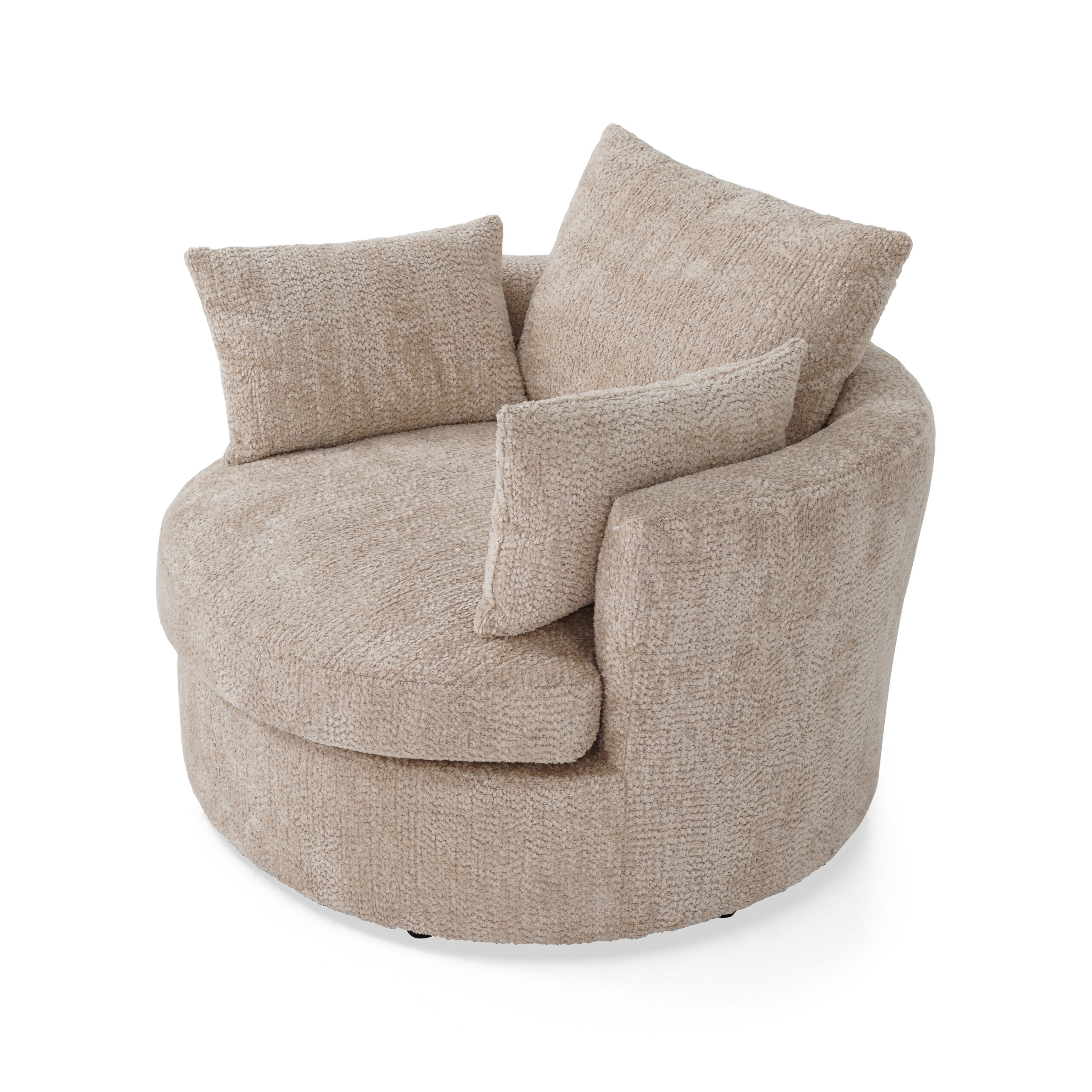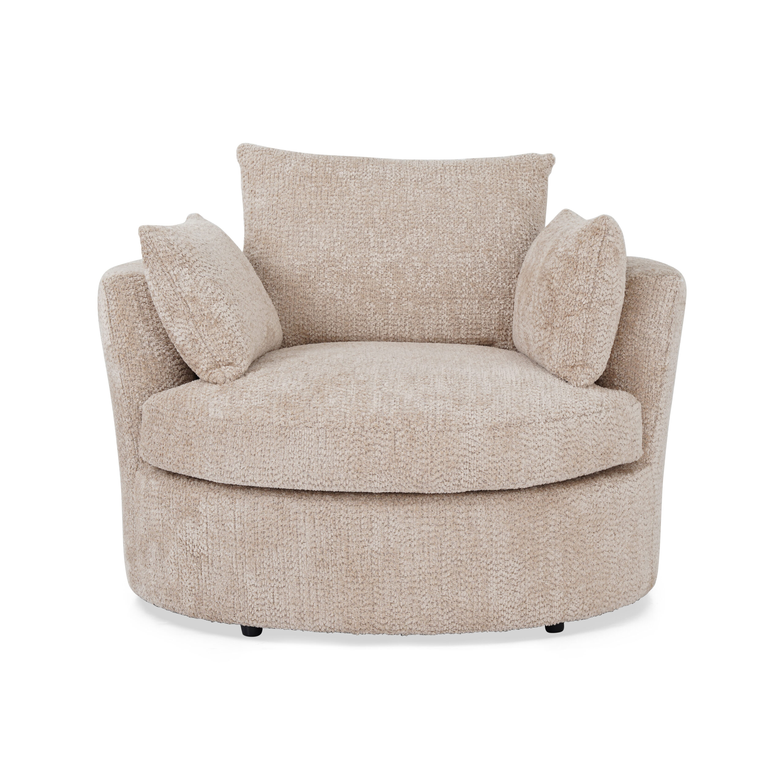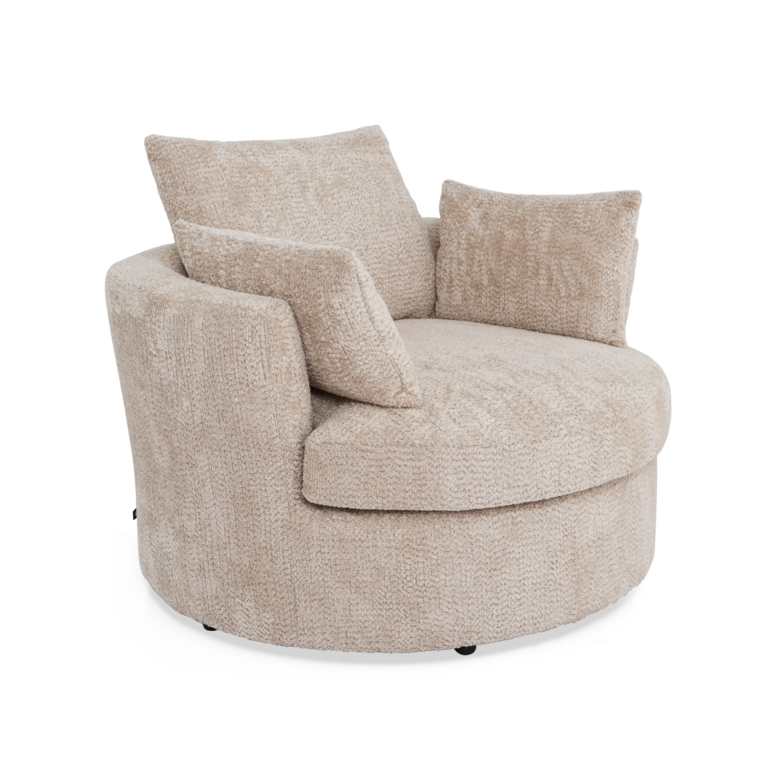 A fully upholstered armchair in beige linen tweed effect, designed with generous proportions and a refined silhouette for a statement of modern comfort.